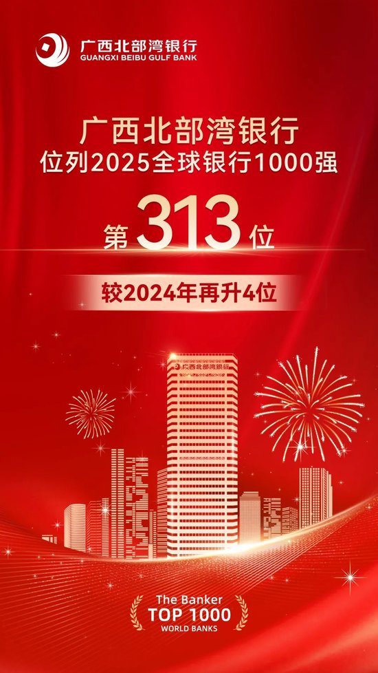 7月2日,英国《银行家》杂志(The Banker)发布2025年“全球银行1000强”榜单,广西北部湾银行排名第313位,较上一年度再升4位,连续7年实现进位,综合实力、核心竞争力和发展韧性持续增强。